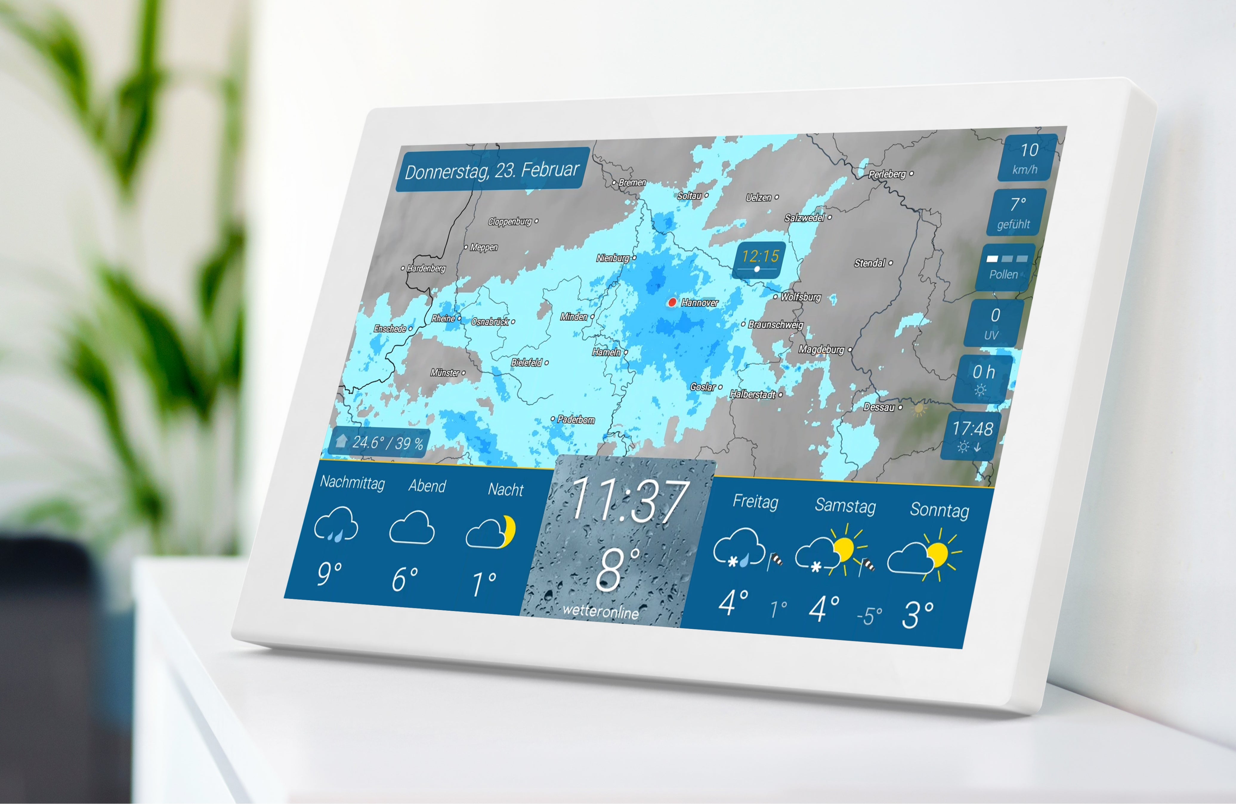 Zu einem angenehmen Klima in Ihrem Zuhause trägt der neue Innenraumsensor bei. Die Angaben zu Temperatur und Luftfeuchte können beispielsweise beim effizienten Heizen und Lüften helfen. Für Allergiker stehen jetzt noch detailliertere Informationen zur Pollenbelastung sowie ein Pollenkalender zur Verfügung. Diese erleichtern sowohl die kurz- als auch die langfristige Planung. Der UV-Index wird neuerdings nicht nur für den aktuellen, sondern auch für die kommenden sechs Tage angezeigt. Die Stufen reichen von „niedrig“ bis „extrem“ und geben einen Hinweis darauf, welche Maßnahmen zum Schutz vor der schädlichen UV-Strahlung ergriffen werden sollten.