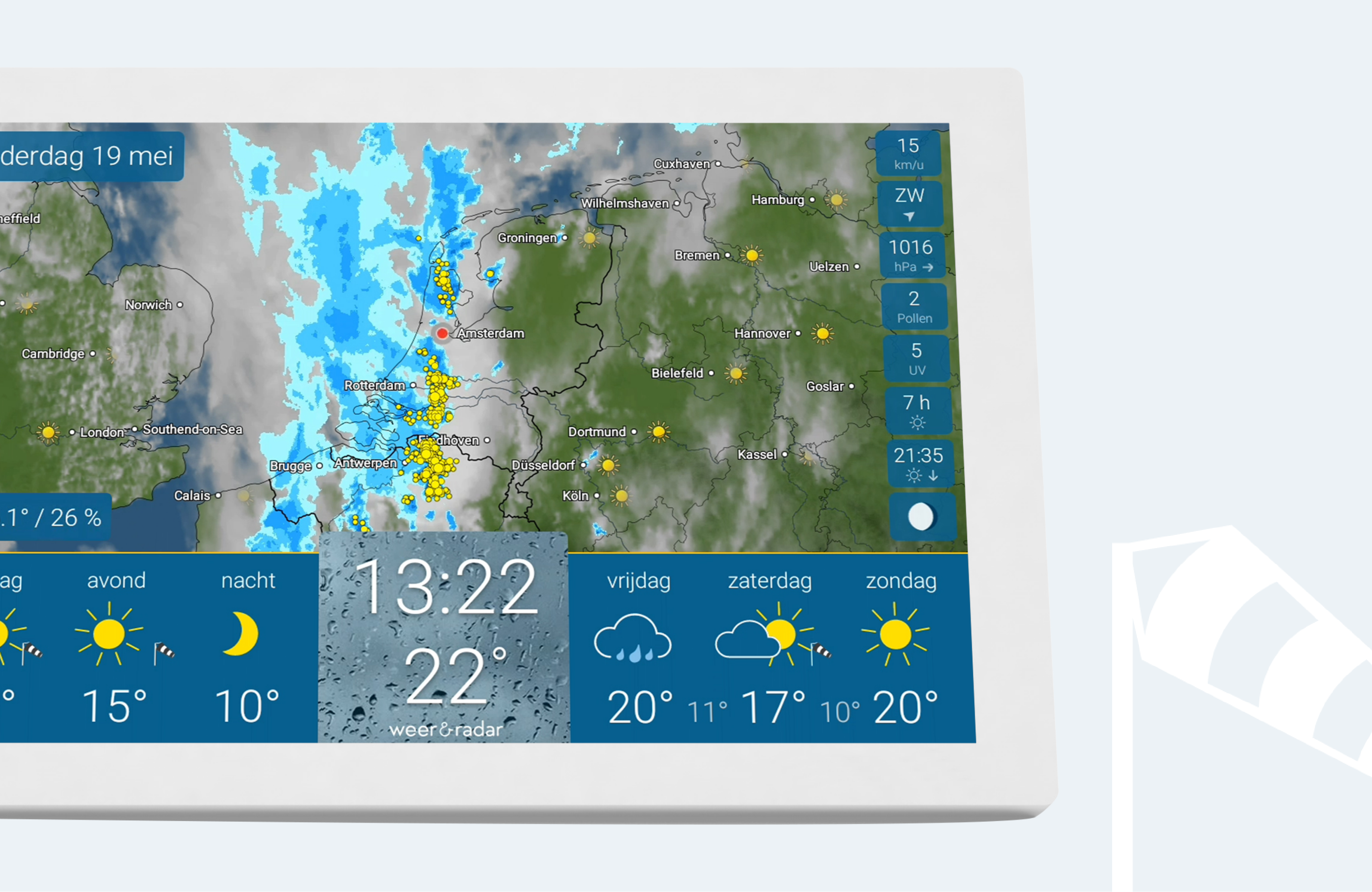 Het apparaat geeft informatie over het actuele weer voor elke locatie wereldwijd, bepaald door de tracking, duidelijk weer op een HD-scherm met stabiele kijkhoeken. Met de WeerRadar kun je het weer de komende 90 minuten live volgen. Zoom dichtbij in voor meer details of verder uit om toekomstige weersontwikkelingen te beoordelen. De Weertrend toont de weersverwachting voor vandaag en de komende dagen. Het weerstation waarschuwt voor extreem weer. Ook kunt u desgewenst aanvullende weersinformatie weergeven.